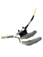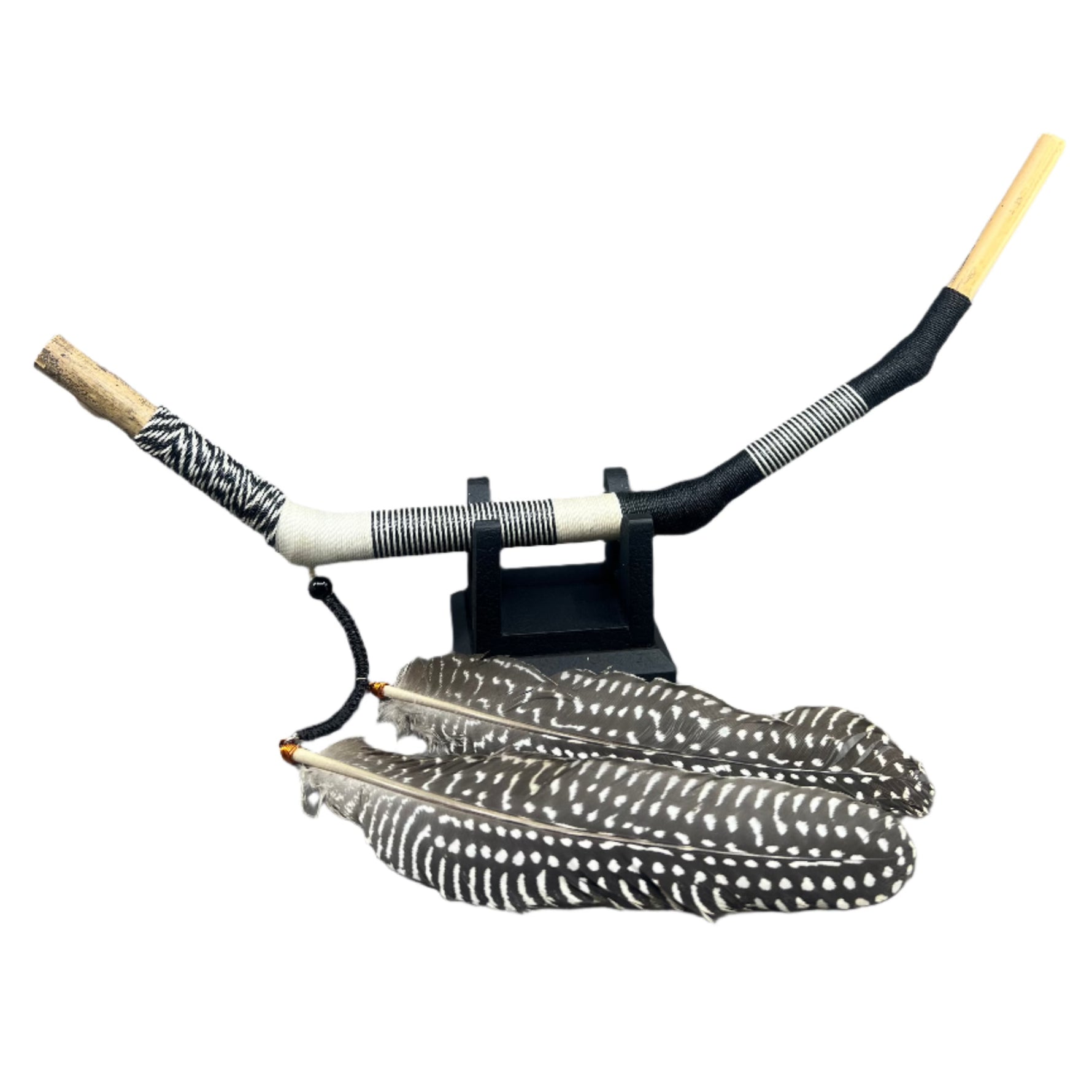 This piece is made from sections of bamboo linked together and has two beautiful Angola feathers hung from it.