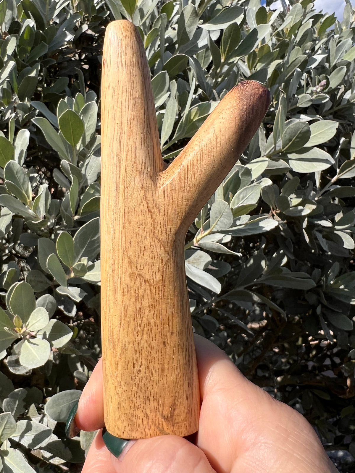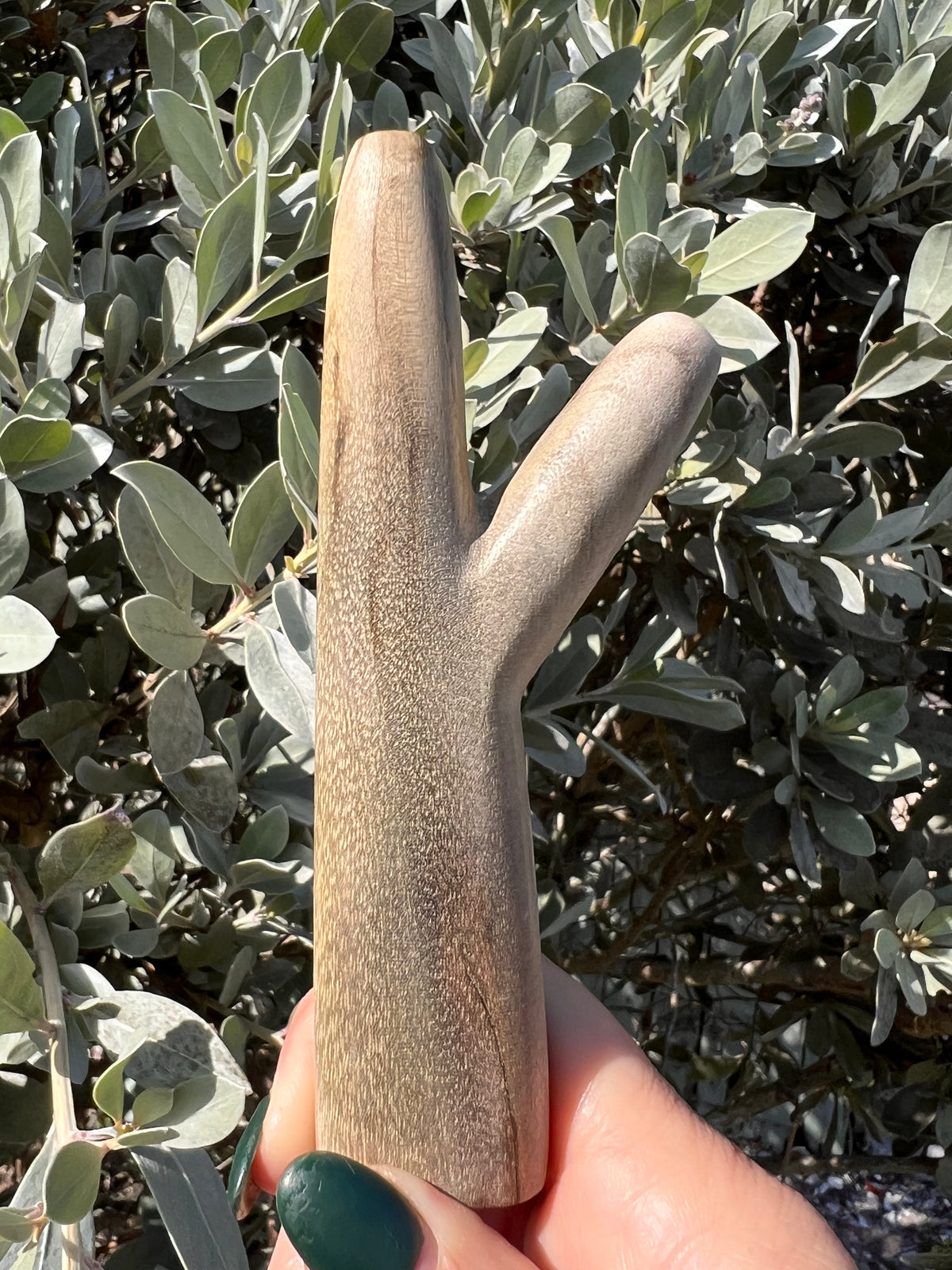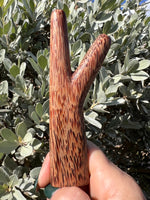 A hand carved piece made from a single block of wood. It fits nicely in the hand while using, pocket while moving about or standing stoutly on your alter. This piece has an fantastic blow and smooth scoop.